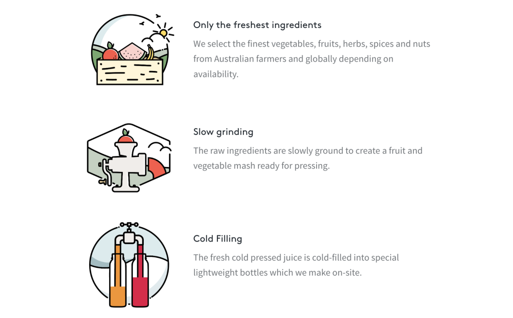 Our design emphasised crisp, fresh visuals and authenticity. Hand-drawn illustrations were created to explain the cold-pressing process, setting Impressed apart from competitors with clear, genuine storytelling. Wide-format imagery showcased the vibrant colours of the juices, reinforcing their health benefits.